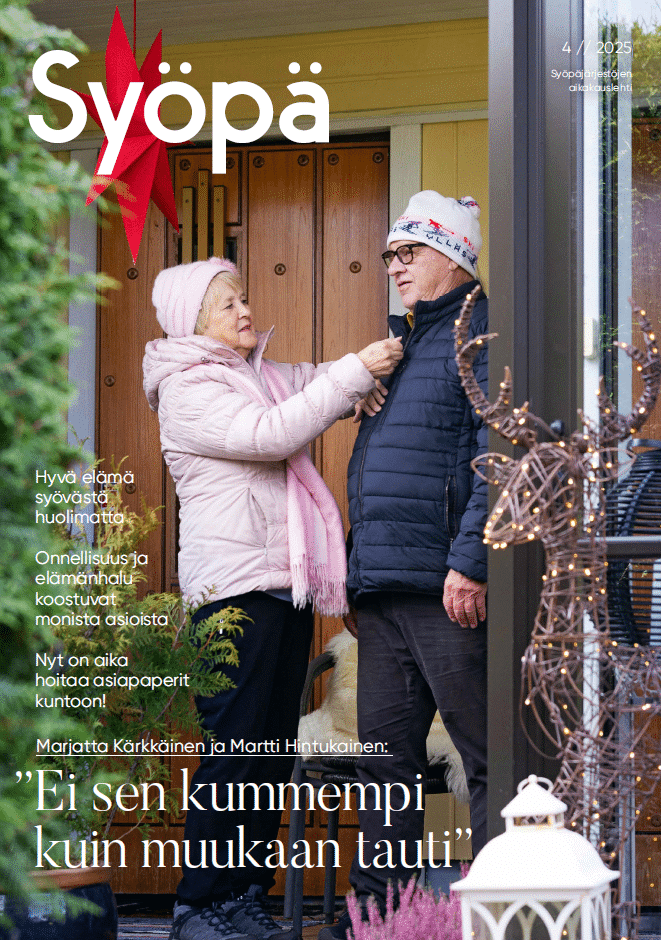 Marjatta Kärkkäinen, 75, on selvinnyt rintasyövästä ja puoliso Martti Hintukainen, 78, eturauhassyövästä. Kesällä Marjatalla todettiin imusolmukesyöpä, jonka hoidot ovat vielä kesken. ”Tässä iässä miltei kaikilla on jotakin vaivaa, isompaa tai pienempää. Meillä on sellainen asenne, että ajatellaan myönteisen kautta ja luotetaan lääkäreihin”, sanoo Marjatta.